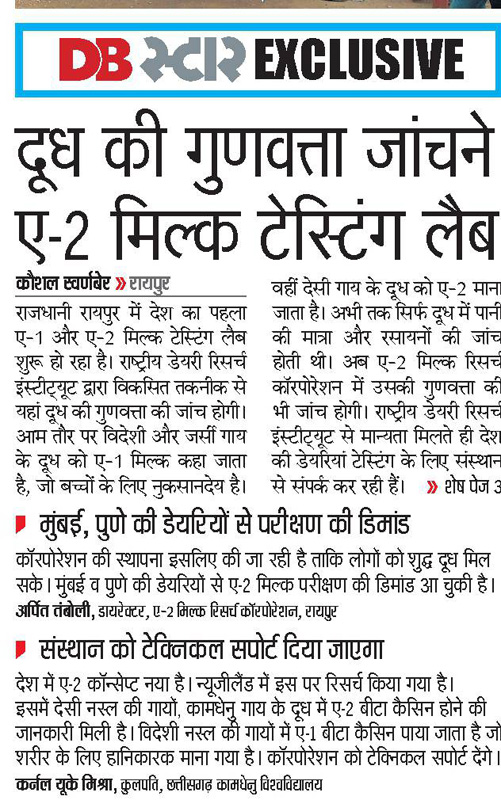A2 Milk Research Corp. was established in 2014 at Raipur, Chhattisgarh (India) and is aimed to protect, promote and strive for self-help for the indigenous neat cattle with the motto of an all-round economic development which is dairy based. A2 Milk Research Corporation is India's first ever lab with DNA Testing facility.